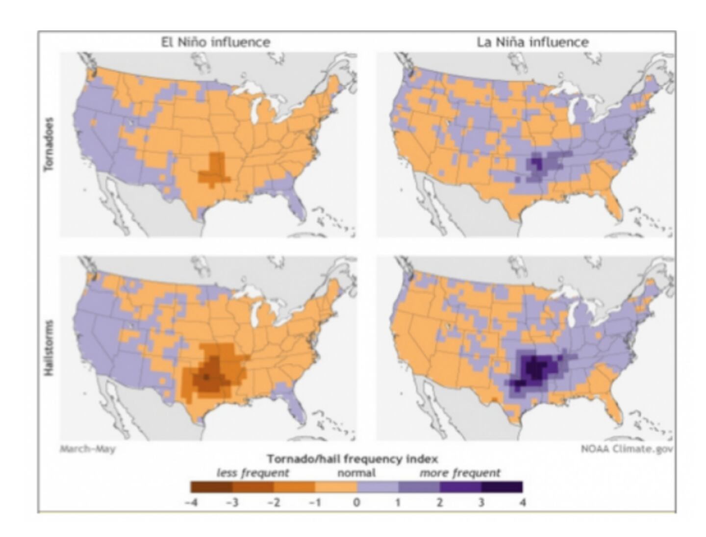 Compared to a LA NINA spring tornado season research shows El Nino tornado concentration tends to be more traditional: