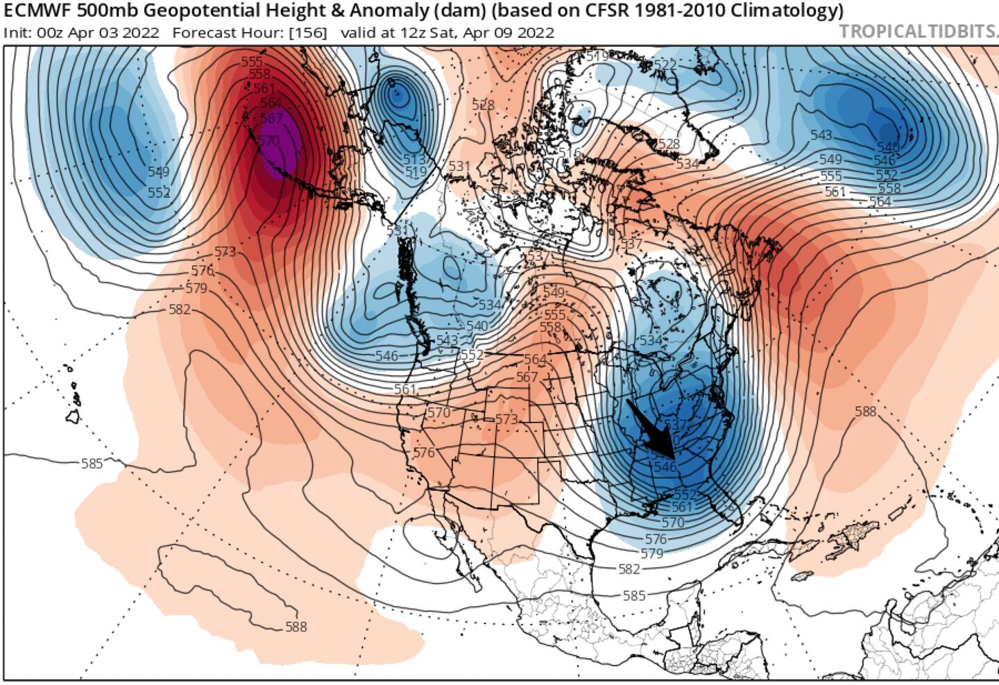 You will see in the maps below a big change in the upper-level air flow from the start of the week (from the Southwest) to the weekend (out of the North/Northwest) as a big jet stream trough develops over the Eastern U.S.