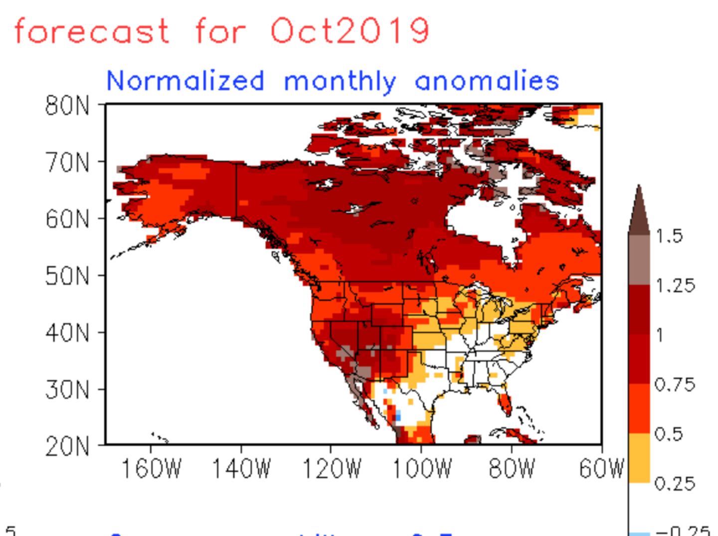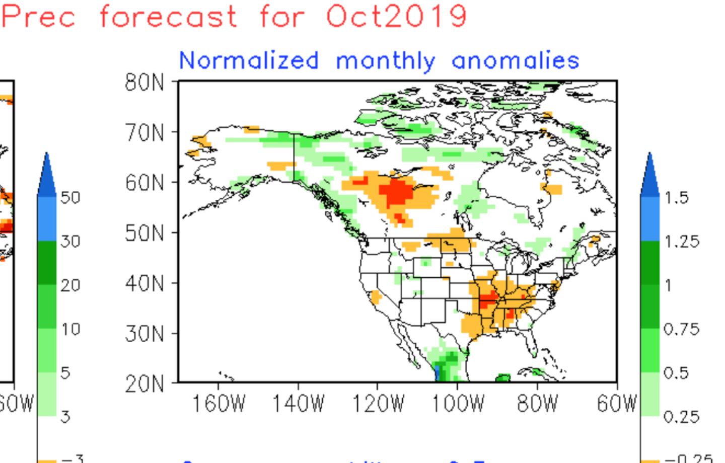 I favor near-normal temperatures to a little above for October on average (warm and cool spells alternate) with below-normal rainfall on average unless a tropical system hits.