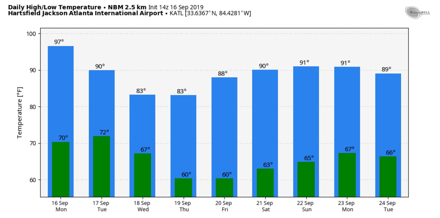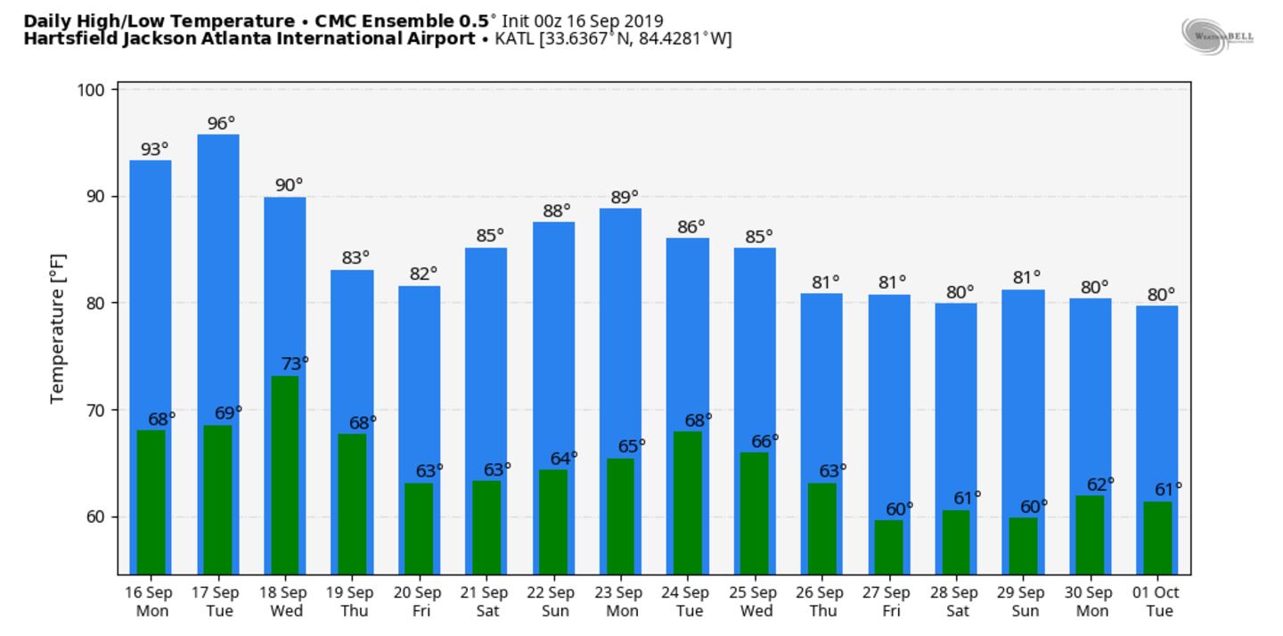 A weak cold front will approach Tuesday (map above) followed by a “wedge” pattern (CAD) with fair weather high pressure wedging down the lee of the Appalachian Mountains funneling in even drier air and helping to lower temperatures some with some clouds from the NE/E air flow as the week goes on (maps below). The chance of rain is not zero but it’s much lower than normal the next 7 days and most of us will stay dry with temperatures a little more Fall-like by the end of the week, especially at night with lows in the 50s and 60s and highs lowering to the low to mid 80s.