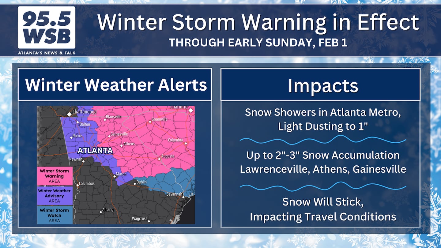 As of Friday morning, a Winter Storm Warning is in effect for eastern half of Metro Atlanta, including I-85 and I-985. This is the area that can expect 2″ to 3″ of snow accumulation, with potentially higher amounts in isolated locations.