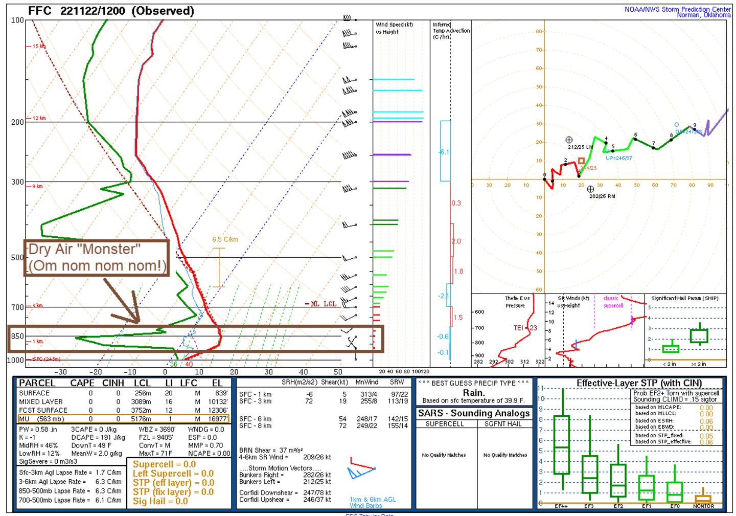 The green line is the dewpoint, and it’s much lower than the red line temperature about a mile above the ground. This is the Dry Air Layer, or for those who are wishing for snow and don’t receive any, this is the “Dry Air Monster” eating your snow!